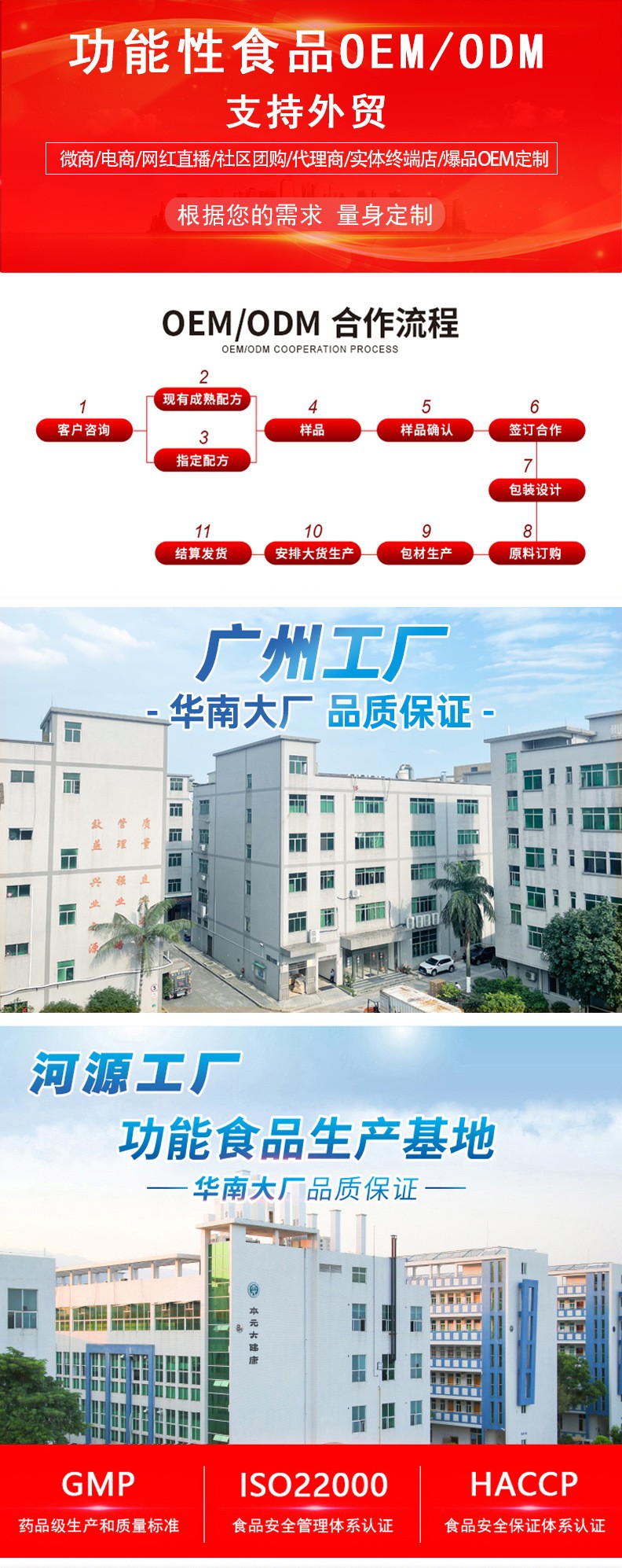 集團公司設有固體車間、液體車間、益生菌專用車間、果蔬發(fā)酵車間。是一家專業(yè)從事食品、功能食品、保健品OEM、ODM供應商,開發(fā)提供各種食品專利配方、藥食同源配方、功能性食品配方。針對美容院線、微商團隊、直銷團隊、電商平臺、抖音商戶等各種渠道開發(fā)針對性產品,保證產品開發(fā)技術的實時性與獨創(chuàng)性,公司可以根據客戶需求提供專業(yè)配方,并協(xié)助客戶申報專利。