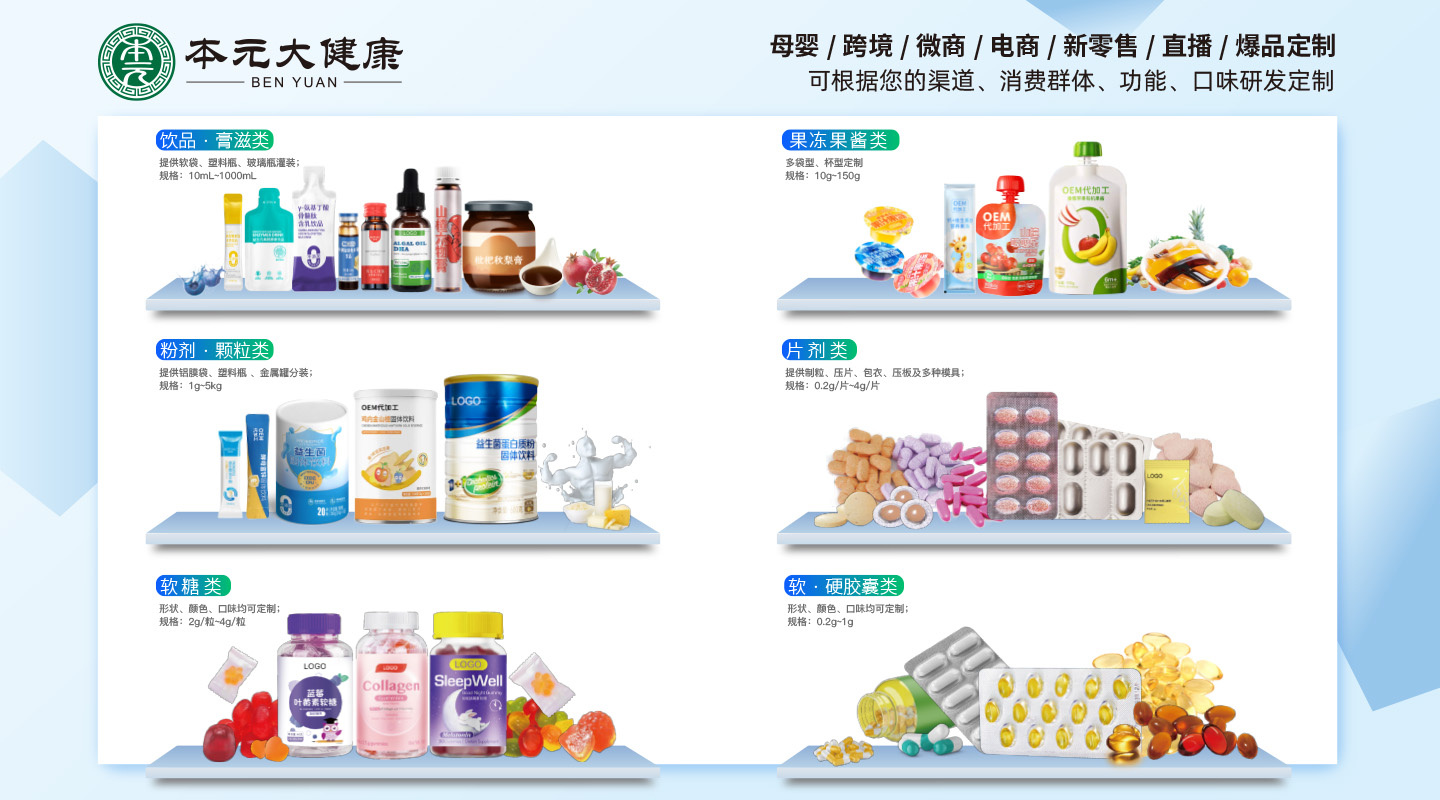 品牌名稱:本元大健康OEM代加工 主營產品:功能性飲品、膏滋、果凍 品牌特色:加工貼牌一站式服務