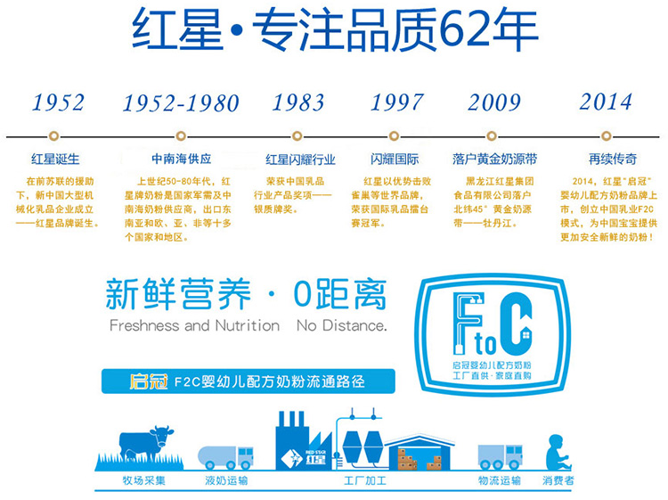 2014,紅星“啟冠”嬰幼兒配方奶粉品牌上市,創(chuàng)立中國乳業(yè)首個F2C模式,為中國寶寶提供更加安全新鮮的奶粉!