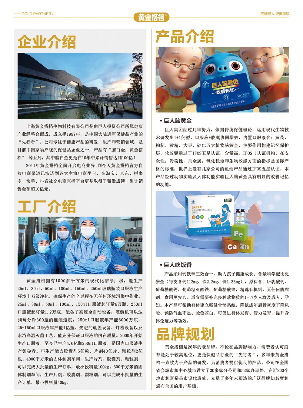 上海黃金搭檔生物科技有限公司是巨人集團(tuán)旗下,由史玉柱傾心打造的一家注冊(cè)資本為1億港元的外商獨(dú)資企業(yè)。公司主導(dǎo)品牌“腦白金”、“黃金搭檔"等旺銷多年,已成為家喻戶曉的知名健康品牌,公司更是憑借產(chǎn)品協(xié)同增效的顯著特點(diǎn)和優(yōu)質(zhì)售后服務(wù),成為老百姓表達(dá)愛心、孝心和保健自用的信賴品牌。山東修企藥業(yè)有限公司為上海黃金搭檔生物科技有限公司授權(quán)全國(guó)母嬰渠道線下實(shí)體運(yùn)營(yíng)商。