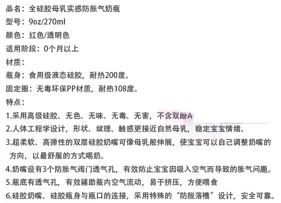 硅膠很柔軟,不用奶瓶刷用手也可以刷到奶瓶的各個(gè)角落,容易清洗。寶寶吸奶時(shí),奶瓶會(huì)隨著奶水的減少而自動(dòng)收縮,始終保持著瓶身內(nèi)外氣壓一致,避免寶寶吸入過多的空氣而導(dǎo)致嗆奶、腹脹等不適,有效解決喂奶時(shí)脹氣的煩惱,從而達(dá)到自動(dòng)呼吸的功能。