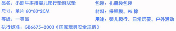 小蝸牛爬行墊無(wú)毒無(wú)味,防潮隔濕,超大無(wú)縫,表面附帶精美的童話圖案,從寶寶學(xué)爬到練習(xí)走路,再到大點(diǎn)在地上玩耍蹦跳,都是不錯(cuò)的選擇,是寶寶健康快樂(lè)成長(zhǎng)的好伴侶。