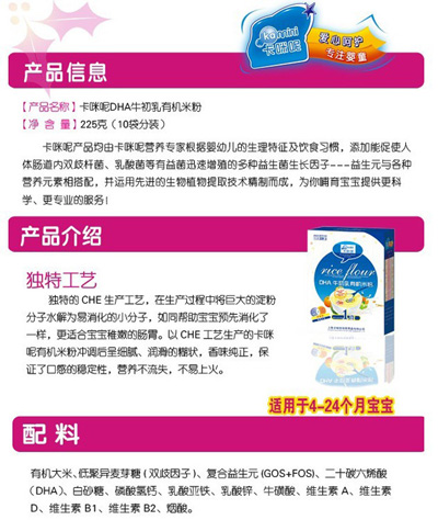 卡咪呢有機(jī)米粉系列是專為中國寶寶設(shè)計(jì)的營養(yǎng)輔食,選用有機(jī)大米,科學(xué)搭配維生素AD等維生素,還特別添加;撬、DHA、AA等有助智力發(fā)育的營養(yǎng)成分,富含15種營養(yǎng)素,F(xiàn)上海卡咪呢母嬰用品有限公司面向全國空白市場區(qū)域誠招卡咪呢有機(jī)米粉代理商。