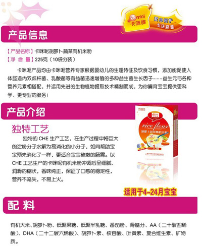 卡咪呢有機(jī)米粉系列是專為中國(guó)寶寶設(shè)計(jì)的營(yíng)養(yǎng)輔食,選用有機(jī)大米,科學(xué)搭配維生素AD等維生素,還特別添加;撬、DHA、AA等有助智力發(fā)育的營(yíng)養(yǎng)成分,富含15種營(yíng)養(yǎng)素,F(xiàn)上?ㄟ淠啬笅胗闷酚邢薰久嫦蛉珖(guó)空白市場(chǎng)區(qū)域誠(chéng)招卡咪呢有機(jī)米粉代理商。