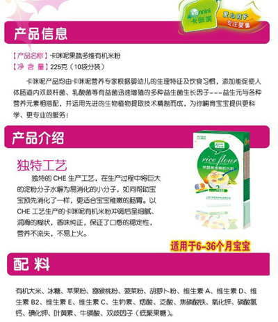 卡咪呢果蔬多維有機米粉是上?ㄟ淠啬笅胗闷酚邢薰酒煜庐a(chǎn)品,精選有機大米和多種新鮮水果、水彩精心研制而成,適合6-36個月的寶寶。該款產(chǎn)品科學配方,富含維生素A維生素D等多種維生素,還特別添加DHA、AA和;撬嵋嬷菭I養(yǎng)組合,營養(yǎng)豐富好吸收。