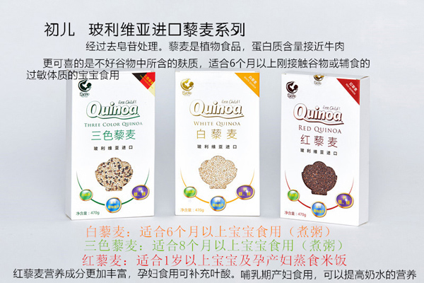 初兒藜麥系列白藜麥、紅藜麥以及三色藜麥三種,由玻利維亞進(jìn)口,品質(zhì)有保障!且已經(jīng)過去皂苷處理,無麩質(zhì),安全健康!