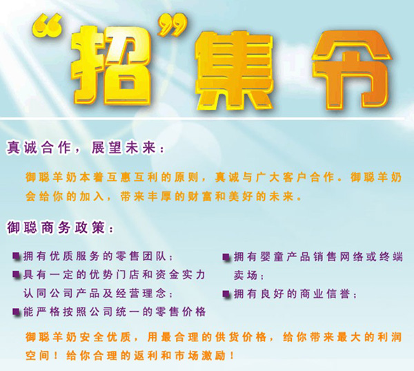 西安御寶羊乳品營銷公司匯集了一大批曾在國內(nèi)知名乳品品牌有著多年實戰(zhàn)經(jīng)驗豐富的營銷精英,在這批激情四溢的營銷精英的精心運作下,結(jié)合前沿市場營銷觀念、運用現(xiàn)代企業(yè)管理制度,短短3年多時間推出了“御寶羊奶”、“御聰羊奶”等家喻戶曉的知名專業(yè)羊奶品牌,銷售網(wǎng)絡(luò)覆蓋全國30個省,終端銷售網(wǎng)點近3000家,銷售規(guī)模翻番增長,今天的“御寶羊奶”已經(jīng)成為當(dāng)之無愧的“中國專業(yè)羊奶領(lǐng)軍品牌”。