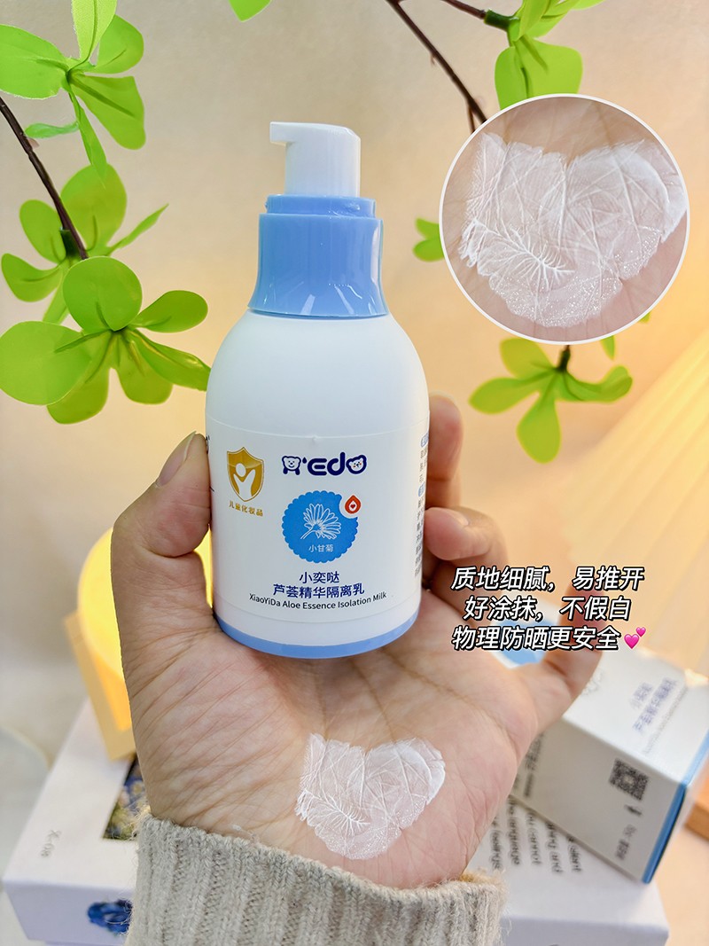 小奕噠蘆薈精華隔離乳,根據嬌嫩肌膚特點設計,以山茶油為主要原料,草本配方,成分溫和安全無刺激,滋潤保濕,隔離防護,減少肌膚傷害。質地輕盈,質感柔潤,延展性強,物理防曬更安全,為肌膚撐起保護屏障。