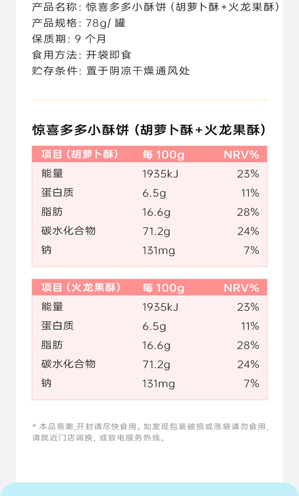 藍(lán)貝多多驚喜多多小酥餅(胡蘿卜酥+火龍果酥)添加胡蘿卜&火龍果,拒絕多余添加,雙拼口味,雙重滿足,低溫烘焙, 非油炸,保留食材中的營養(yǎng)成分,鎖住食材色香味,海藻糖更益牙,不會引起齲齒,獨(dú)立小包,定時(shí)定量。