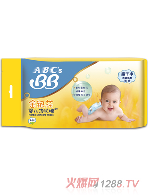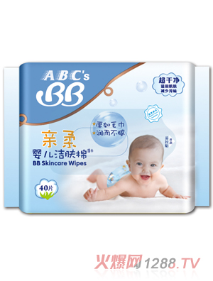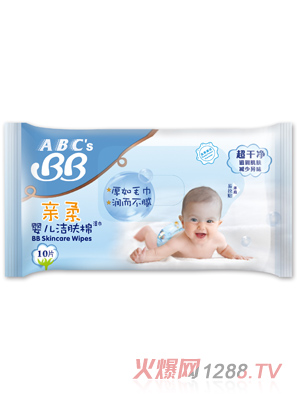 ABC’s BB潔膚棉(濕巾)產(chǎn)品用料高檔,厚如毛巾,潤而不膩,在清潔的同時呵護(hù)bao--bao幼嫩的肌膚。濕巾產(chǎn)品包裝從片便攜裝到片家庭裝,方便媽媽和bao--bao在任何場合隨時使用。目前濕巾產(chǎn)品擁有三個系列,ABC’s BB 親柔潔膚棉(濕巾)、ABC’s BB金銀花潔膚棉(濕巾)、ABC’s BB沁爽蜂蜜手口用潔膚棉(濕巾)。